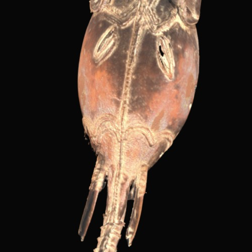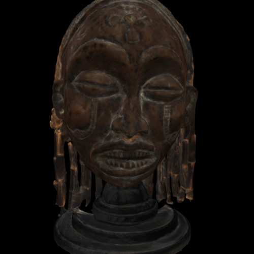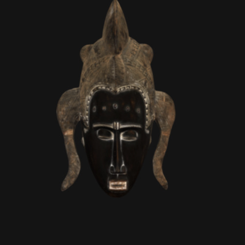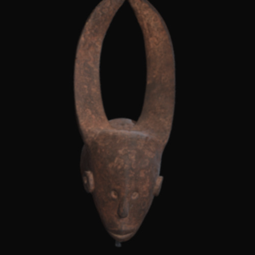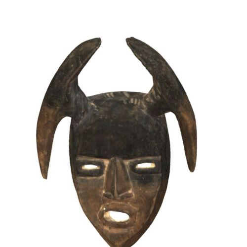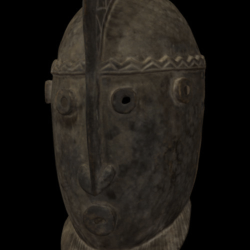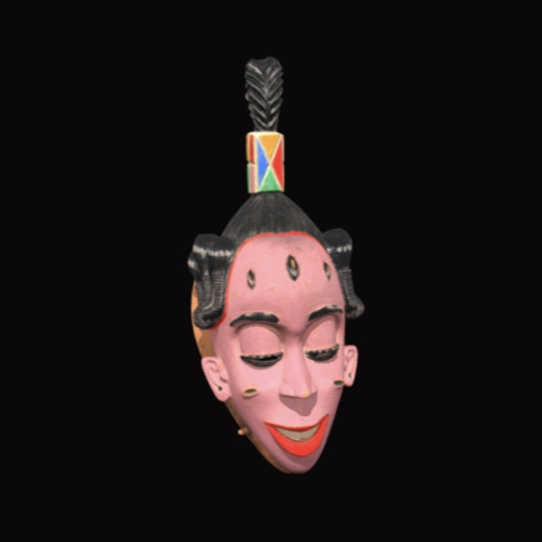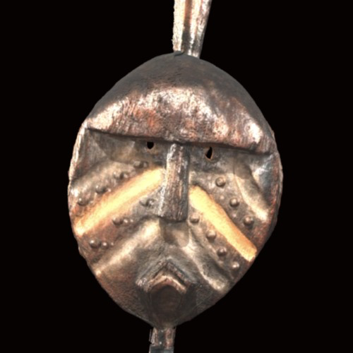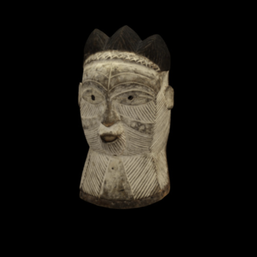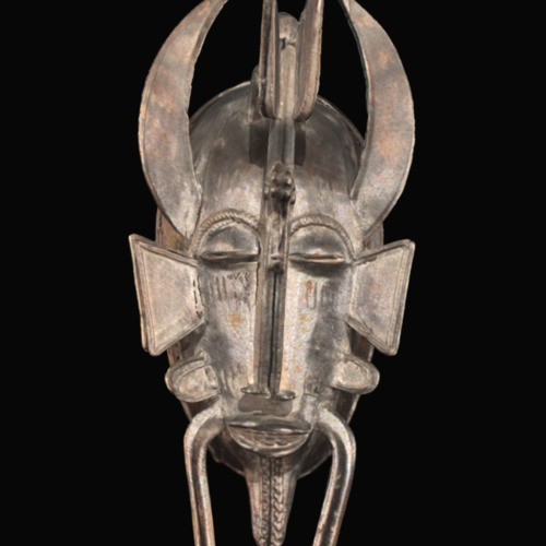 The Senufo people’s masking tradition is influenced by the Poro Society, a secret male group who organize and conduct funerals of the Senufo people. At funeral ceremonies, spirit masks emerge from the forest to escort the soul of the deceased to its final resting place. Masks are also used for agricultural celebrations and conflict resolution. Features include an elongated nose, sharp horizontal brow, pattern of scarification and bird crest.