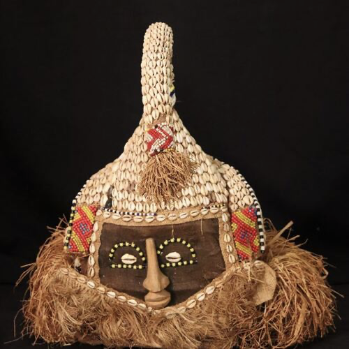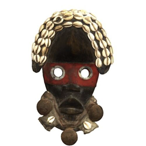 Adorned with cowrie shells, the mask features bold, contrasting colors: the stark white of purity, the deep black of the earth, and the vibrant red that speaks of fire and transformation. The mask’s round, protruding eyes, are windows to the spiritual world, allowing the wearer to see beyond the physical realm.