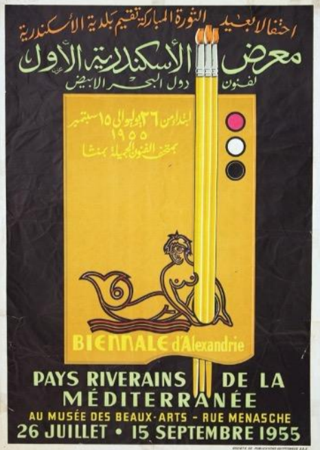 The Biennial positioned Alexandria and the Mediterranean as a whole in a transnational and polyvalent space. It emphasized and paid homage to the Greco-Roman history of Alexandria, but also allowed the space to construct and shift narratives, subjectivities, and art. It was the only event in the Middle East and Africa of its kind at the time; it is still Egypt’s longest running international exhibition today. The first poster for the Biennale was designed by Egyptian artist Izzat Ibrahim (1919-1993) and emphasized the notion of third worldism from President Nasser and that the international exhibition was organized around Mediterranean history, culture, and politics, like of Egypt’s ancien regime.