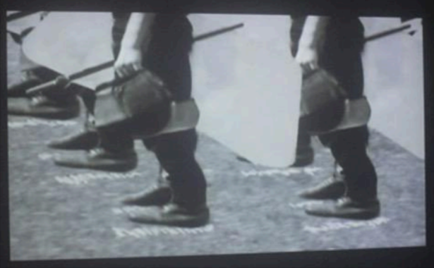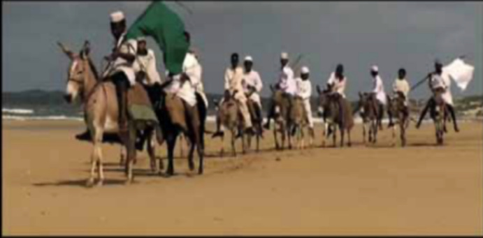 Wael Shawky’s video, Telematch Crusades (2009), won the Biennial’s Grand Prix prize and showed a pilgrimage of Black men on donkeys dressed in white tunics, crossing a long and empty beach carrying a green flag. In the video, they reach a fortress which they veer away from. The title references today’s crusades as televised matches, which insinuates themes of immigration, displacement, and forced territorial issues. The video shows the Crusaders as already having settled their land without regard to its Indigenous inhabitants.